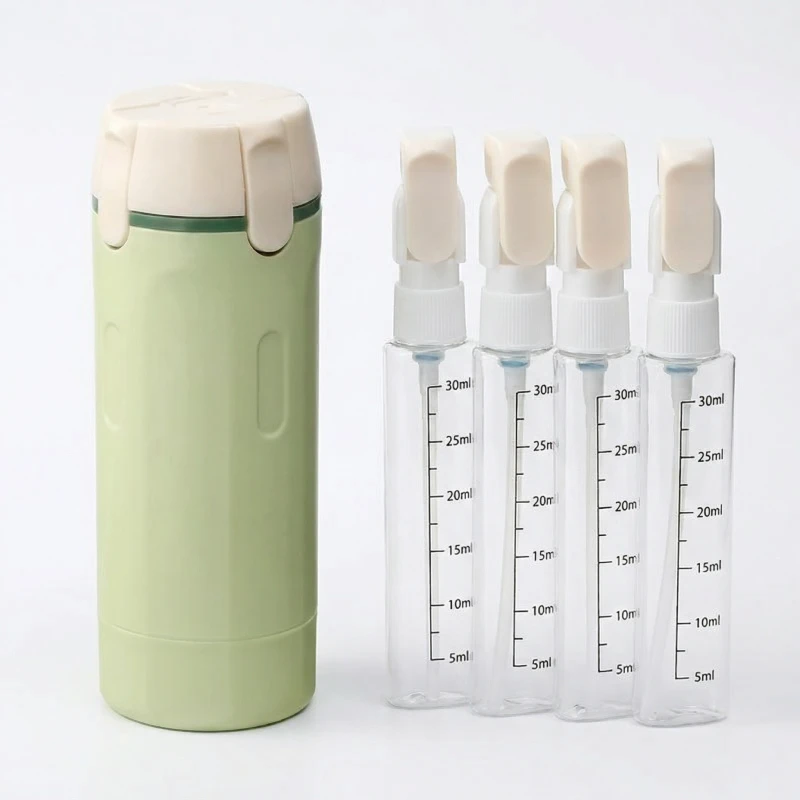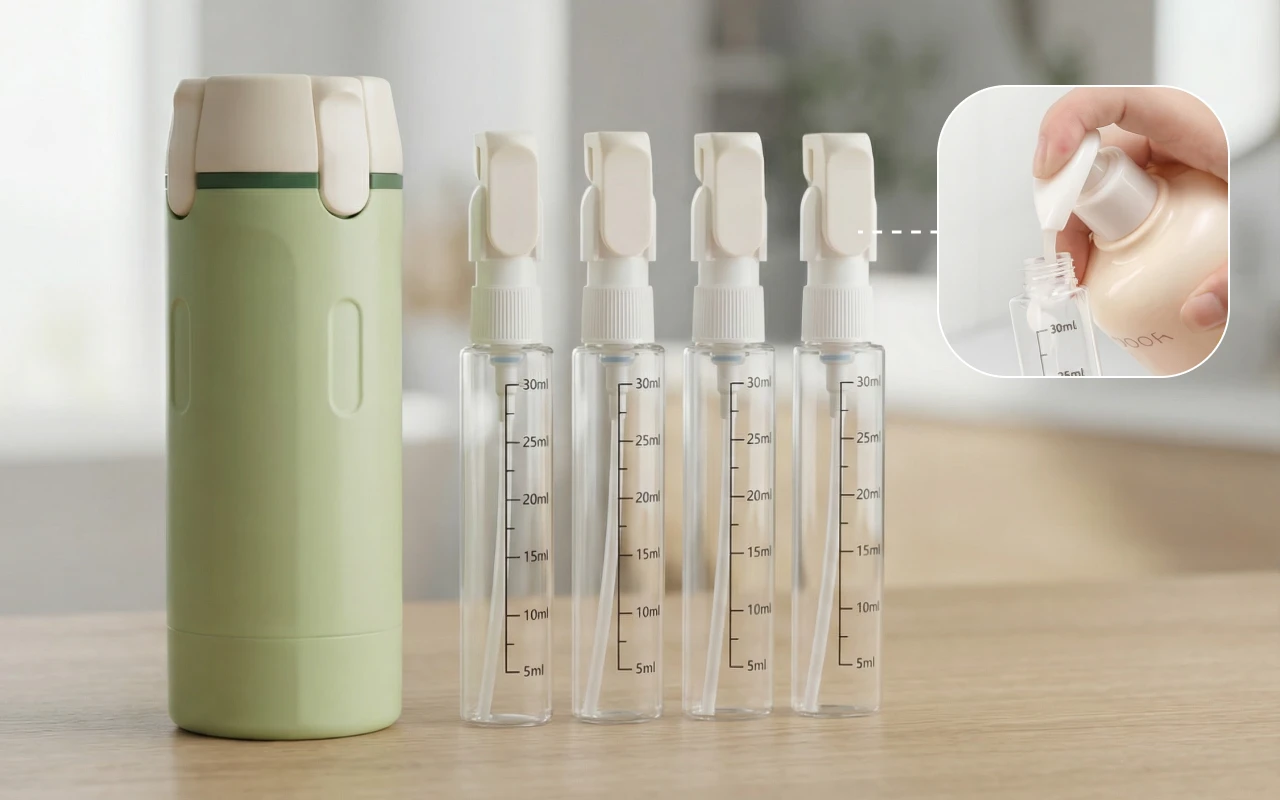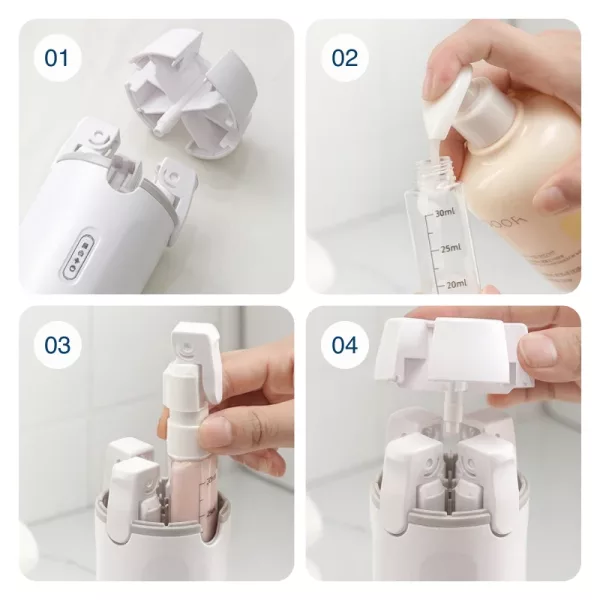 Ya no tengo que buscar botellitas en mi maleta. Esto mantiene todo en un solo lugar. Rellenarlo también es muy fácil.