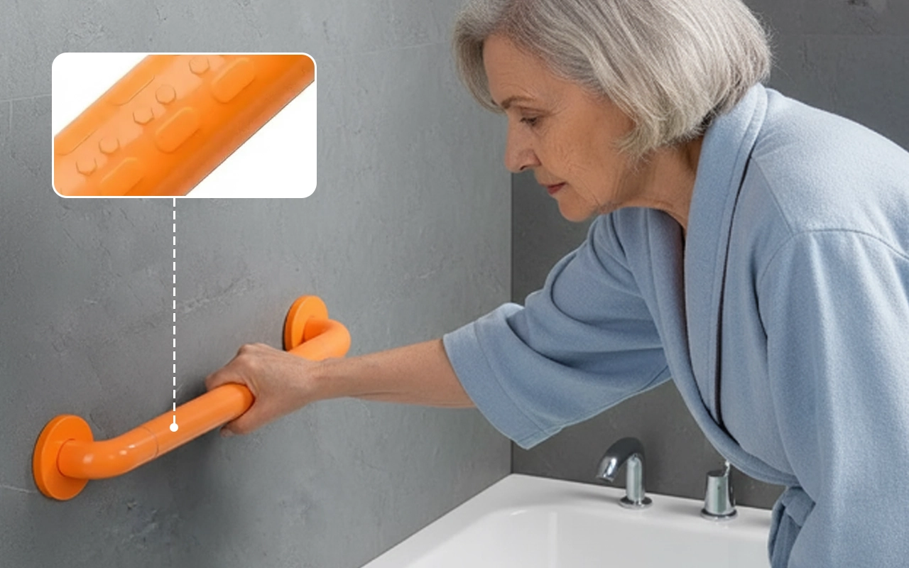 Puse este pasamanos para mi papá el mes pasado. Ahora se siente seguro al entrar y salir de la ducha. Ya no me preocupo por resbalones.