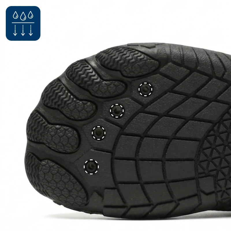 El agua se escurre rápidamente, por lo que los pies nunca se sienten empapados. Esto significa que puedes seguir caminando o nadando sin molestias.