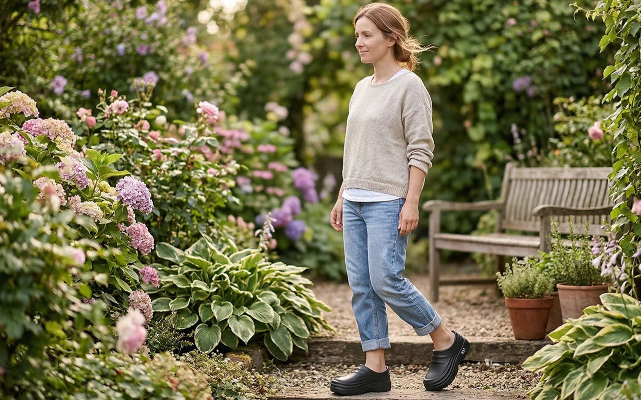 Después de un largo día regando plantas y limpiando el patio, mis pies normalmente sufren. Con estos zuecos termino las tareas sin dolor y sin resbalones en la piedra mojada.