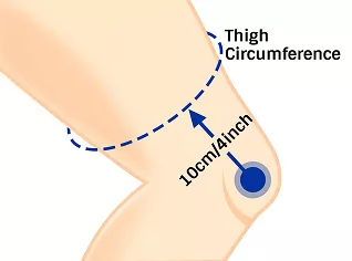 - 1. Dobla la pierna en un ángulo de 30° y mide la circunferencia de tu muslo a 10 cm (4'') por encima de tu rodilla.