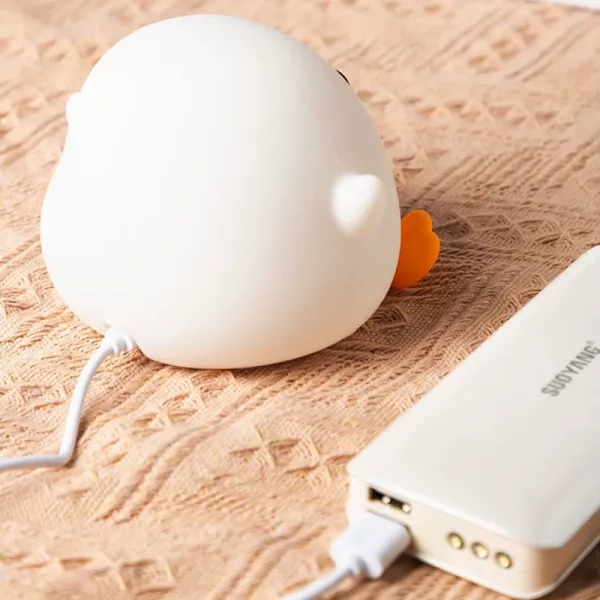Llevamos la lámpara de patito a pijamadas y campamentos. Cabe fácilmente en una bolsa, se carga por USB y el brillo suave hace que las habitaciones desconocidas se sientan amigables.