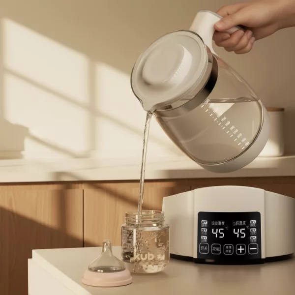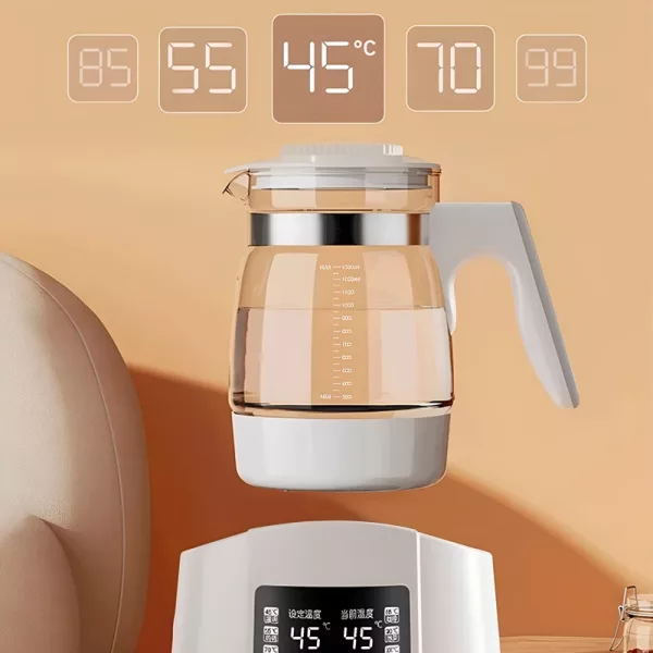 Me gusta cómo este calentador mantiene la leche a la temperatura adecuada. Las piezas de vidrio y acero parecen seguras y limpiarlo es súper fácil cada vez.
