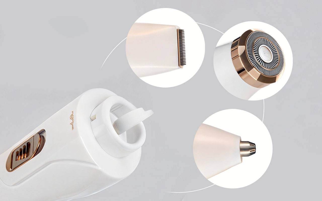 Tres accesorios cubren el rostro, las axilas, las piernas y la línea del bikini. Un dispositivo compacto cabe en cualquier lugar para un cuidado personal sin esfuerzo en todas partes.