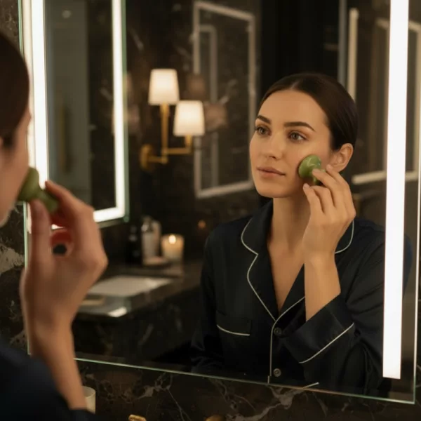 Mi ritual de autocuidado favorito es usar este rodillo cada noche. Reduce mis mejillas hinchadas y la piedra fría se siente perfecta después de un día largo.