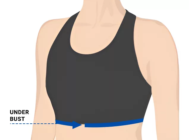 - 2. Para encontrar la medida bajo el pecho, envuelve la cinta métrica alrededor de tu torso, directamente y de manera uniforme debajo del busto.