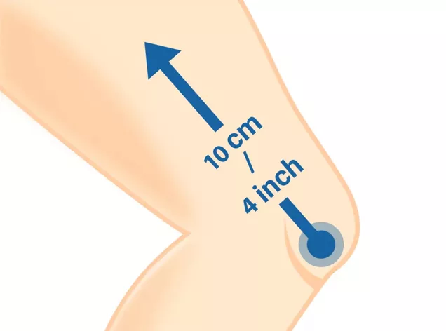 - 2. Envuelve la cinta métrica alrededor de la parte más ancha de tu muslo, aproximadamente 10 cm/4" por encima del punto medio de la rótula.
