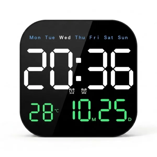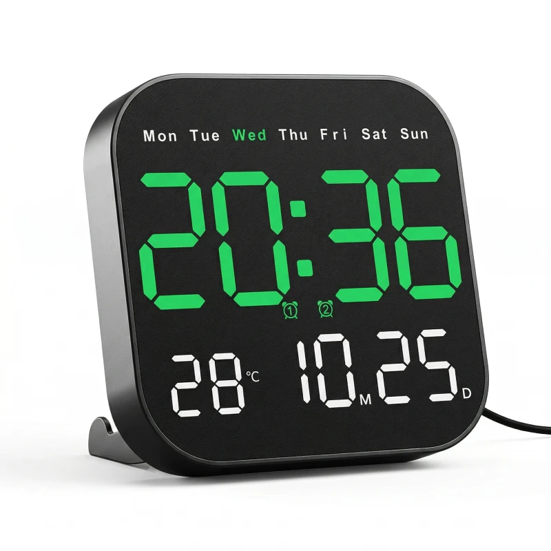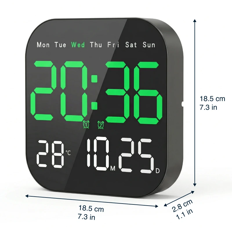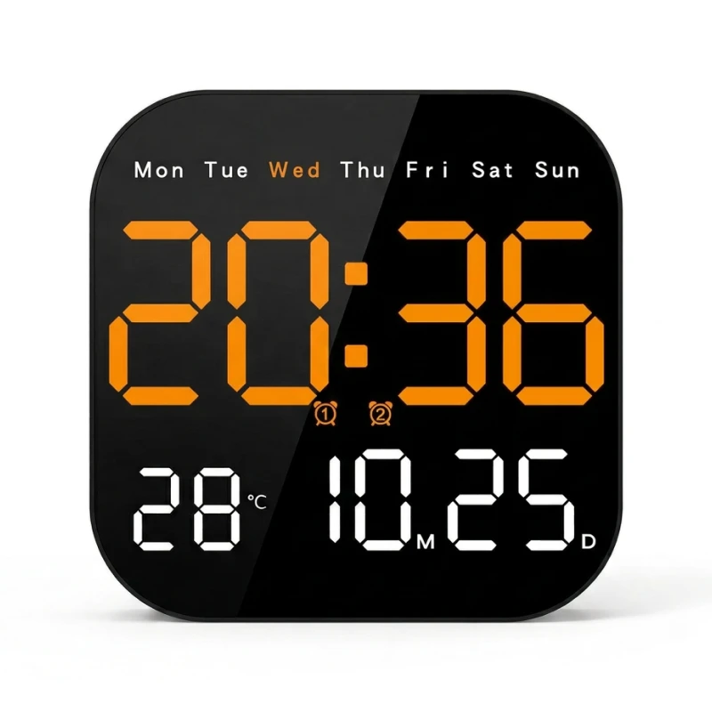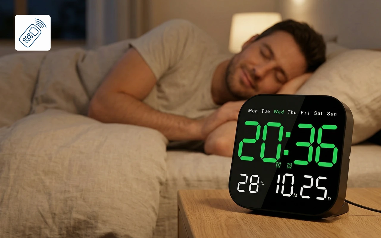 El reloj de pared Ortorex mantiene las rutinas estables en cada habitación. Una sola pantalla muestra el día de la semana, el calendario y la temperatura interior. Cambie la configuración desde la cama usando el mando a distancia. Diez niveles de brillo se adaptan a las siestas, las películas y las mañanas.
