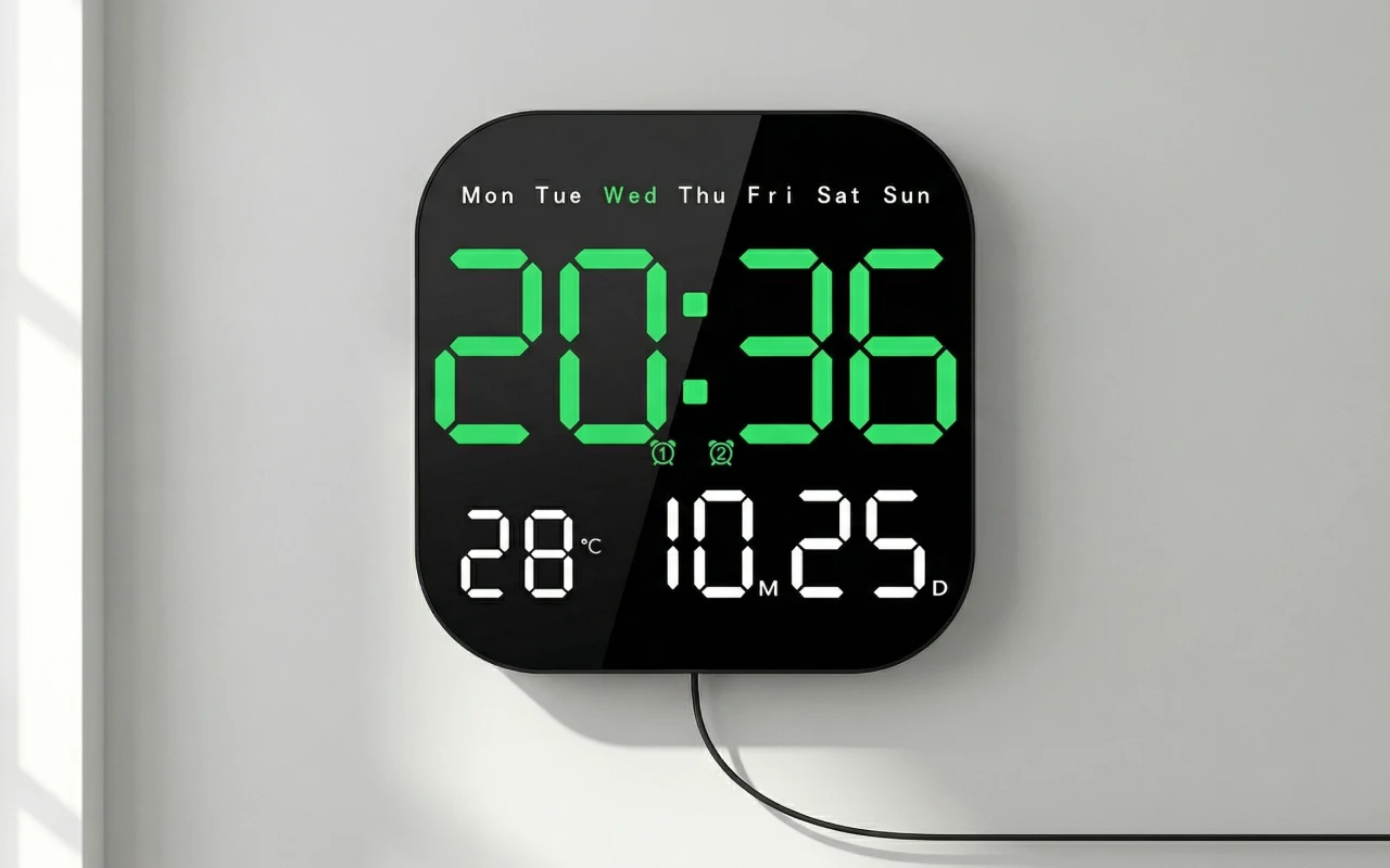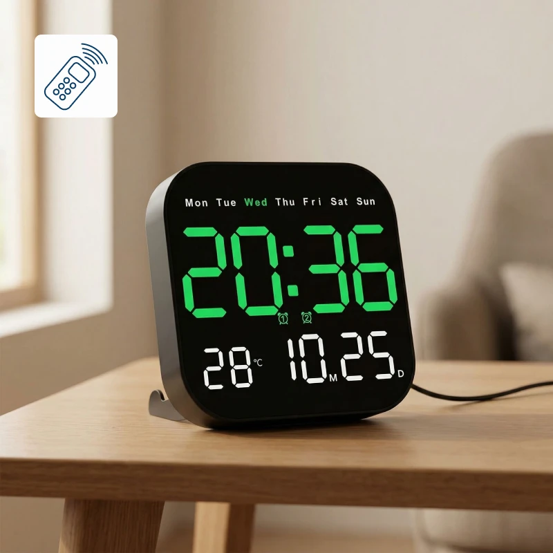 Instalé este reloj en mi cuarto de manualidades para no perder la noción del tiempo; el control remoto me permite ajustar el brillo sin levantarme de la mesa.