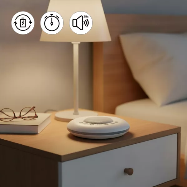 Dejo el ruido blanco encendido toda la noche y uso la luz cálida nocturna para las visitas al baño. La batería dura bien y se recarga rápido con USB-C.