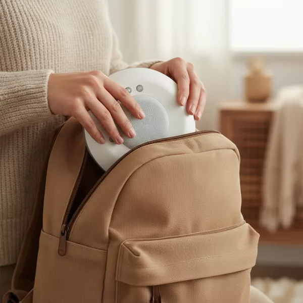 El ligero dispositivo Ortorex se desliza fácilmente en bolsos o maletas. Recárgalo rápidamente por USB-C para disfrutar de momentos de paz en cualquier lugar.