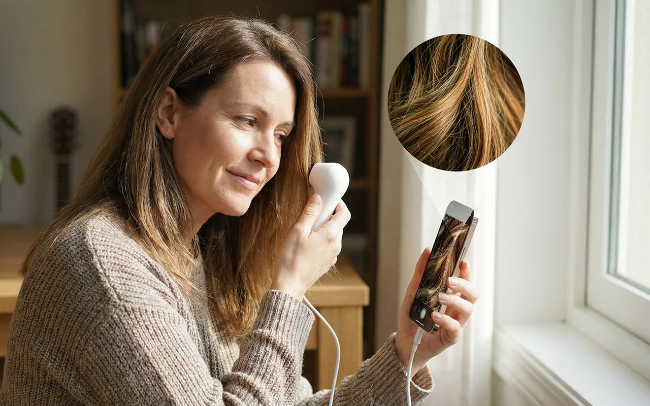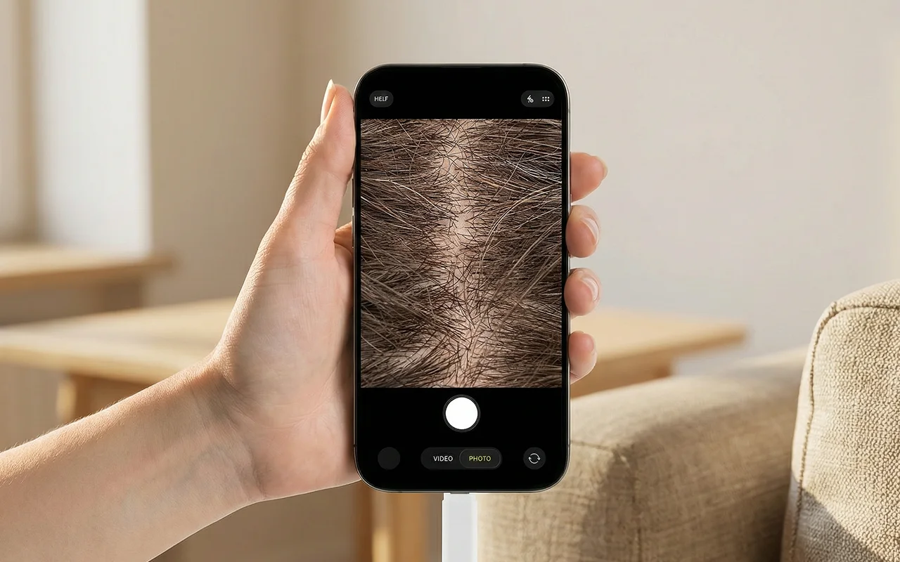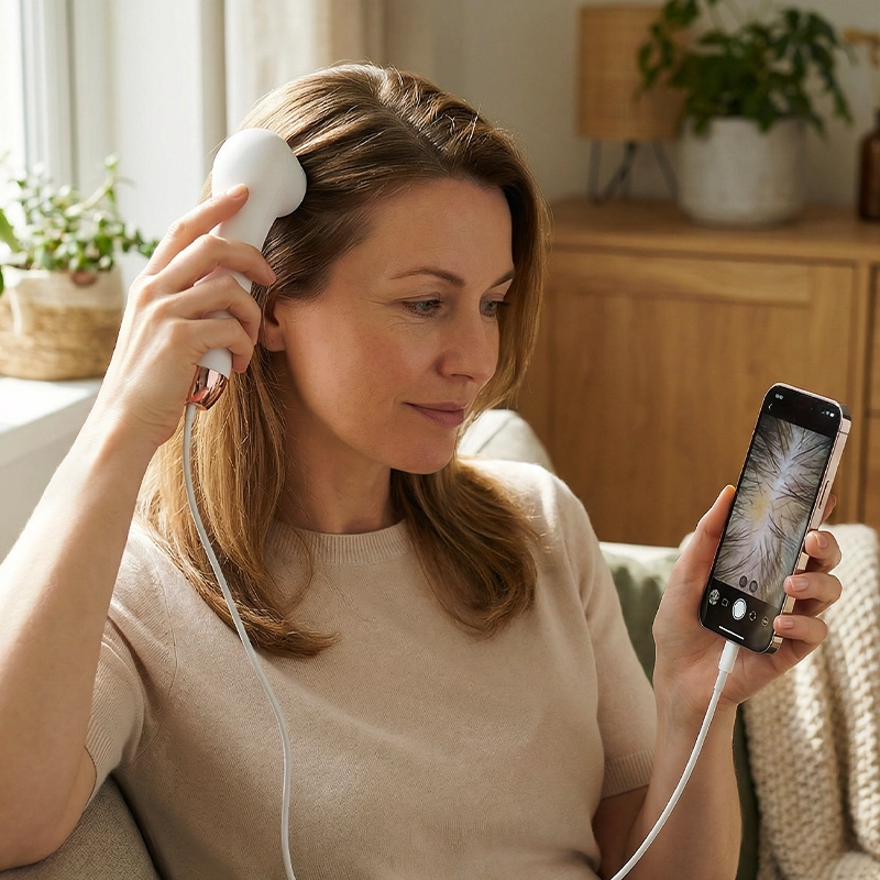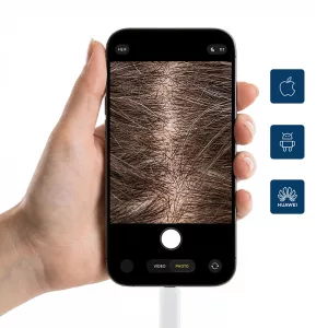 La cámara para el cabello Ortorex te permite ver la piel de cerca sin distorsión. Puedes detectar problemas ocultos rápida y fácilmente.