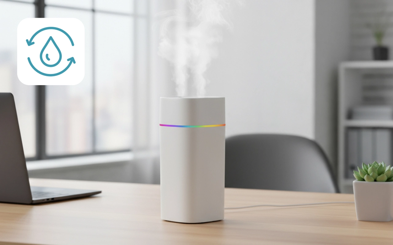 Coloqué este pequeño dispositivo en mi escritorio de trabajo y evita que mi piel se reseque mientras trabajo todo el día. Los colores hacen que mi espacio se vea acogedor.