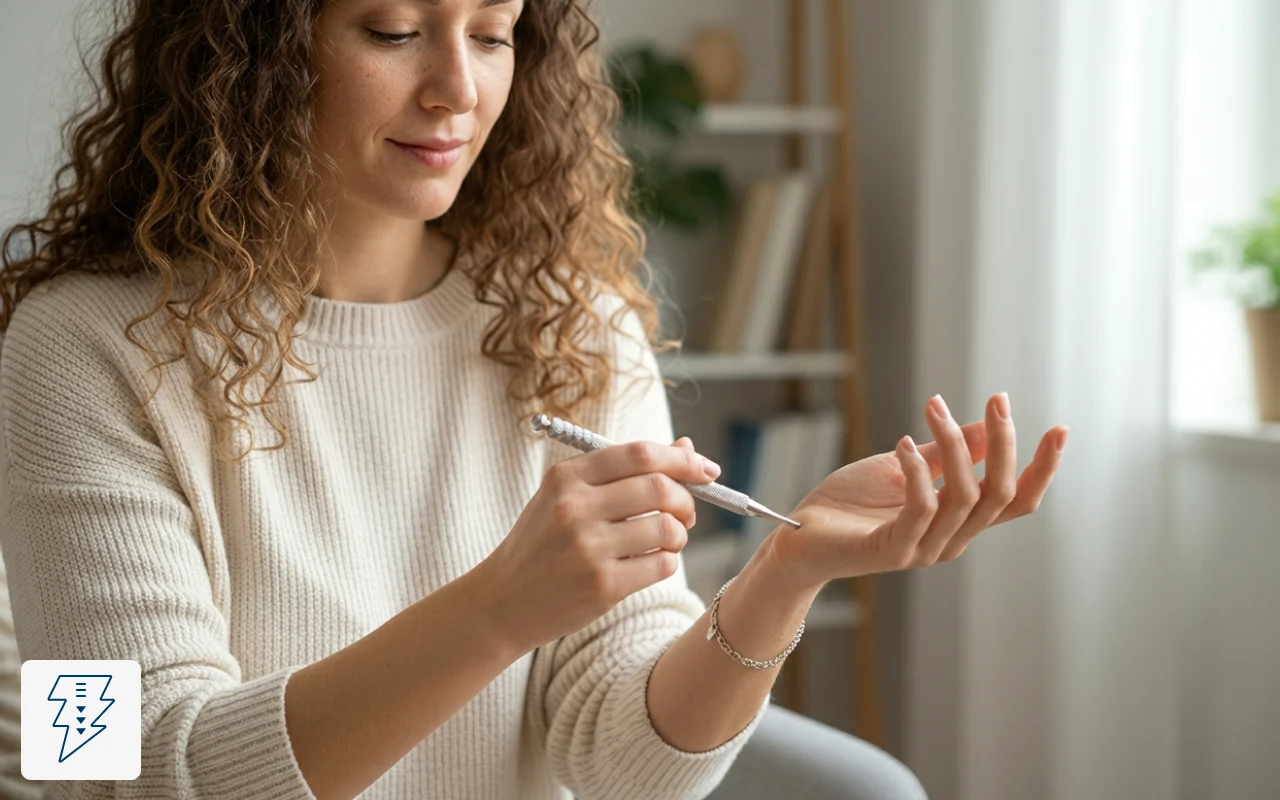 Experimenta un alivio suave usando a diario el bolígrafo de acupuntura Ortorex. Los músculos cansados se relajan rápidamente mientras el estrés se disipa. El diseño ligero encaja perfectamente en cualquier bolsillo o bolsa. Siéntete mejor dondequiera que vayas.