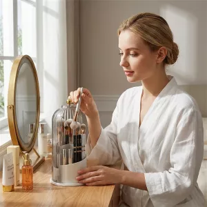 Una tapa transparente protege tus herramientas de belleza del polvo y las salpicaduras. Las brochas se mantienen frescas y limpias para obtener resultados impecables cada día.