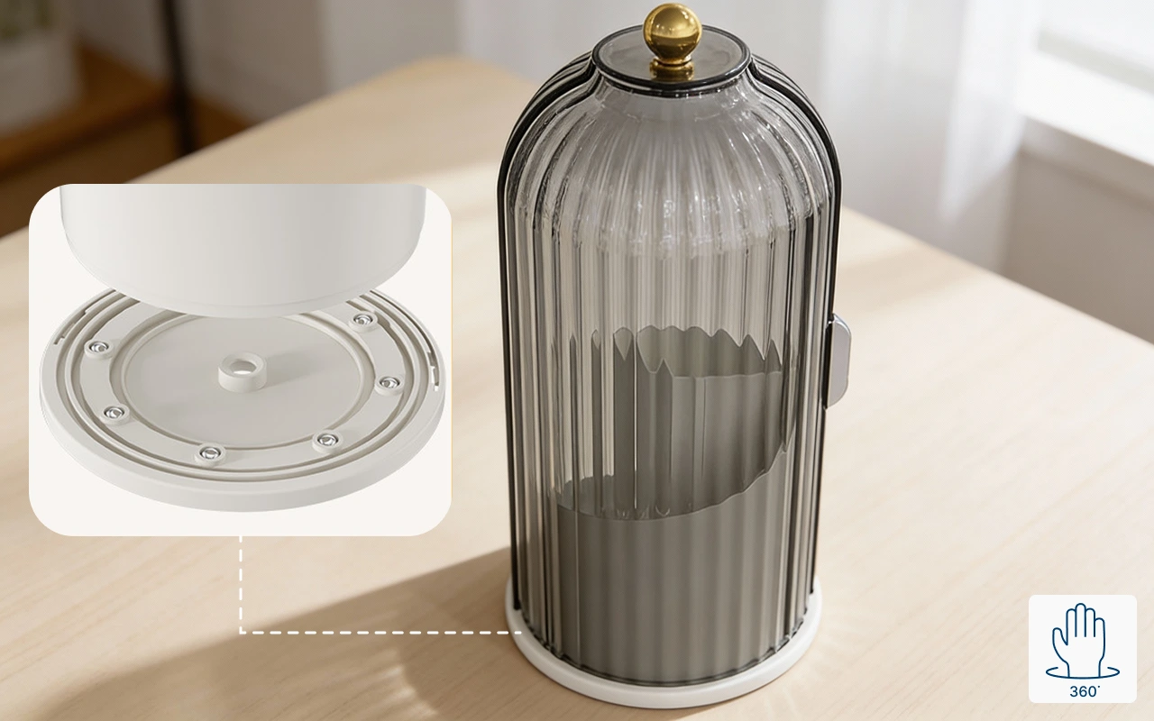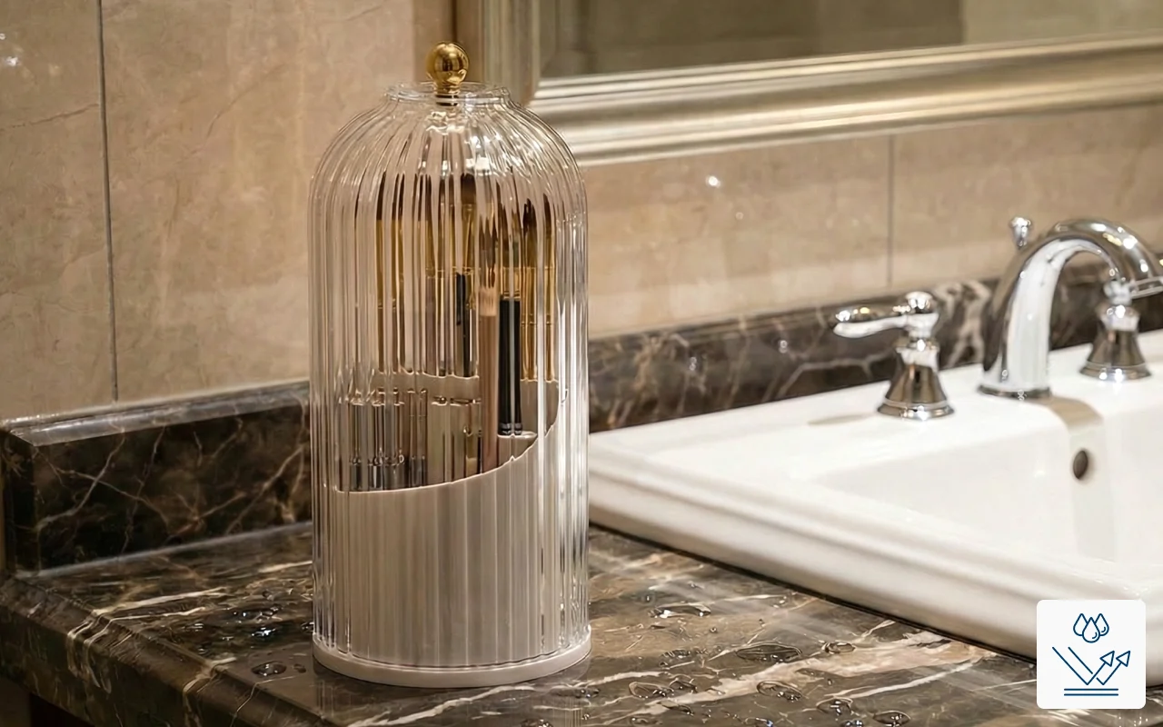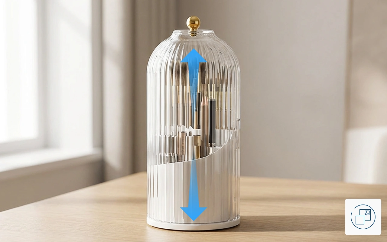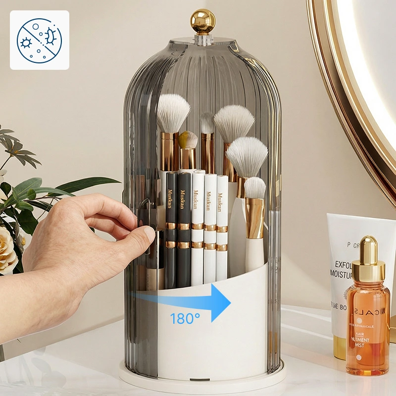 Una tapa transparente protege tus herramientas de belleza del polvo y las salpicaduras. Las brochas se mantienen frescas y limpias para obtener resultados impecables cada día.
