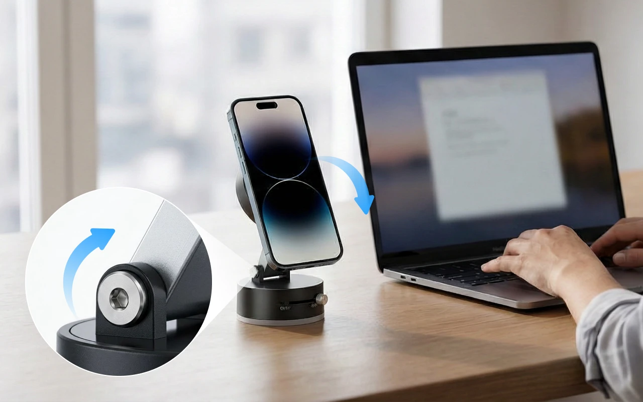 Este soporte para el móvil es mi compañero de viaje ahora. Simplemente lo pongo en el escritorio del hotel para videollamar con mi familia. Se guarda rápido y ocupa muy poco espacio.