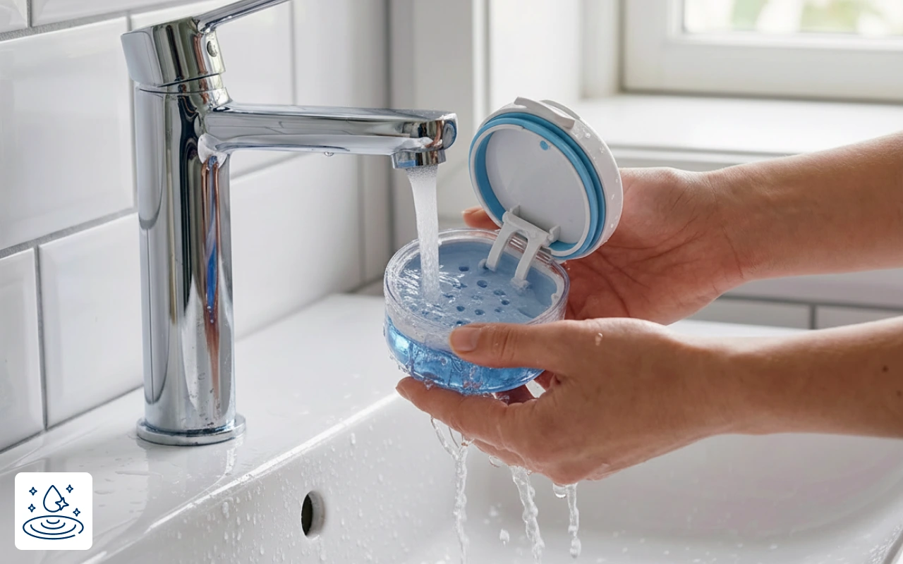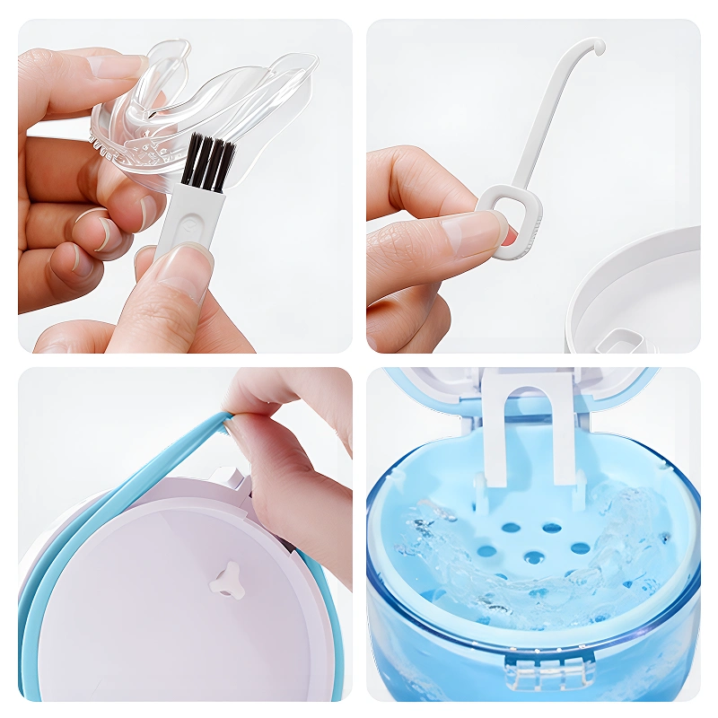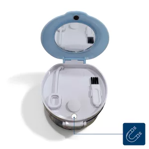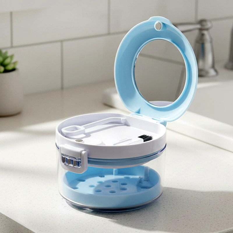 Compré este estuche para las prótesis parciales de mi esposo. El sello mantiene el polvo fuera y me gusta que puedo meter todo en el lavavajillas cada fin de semana.