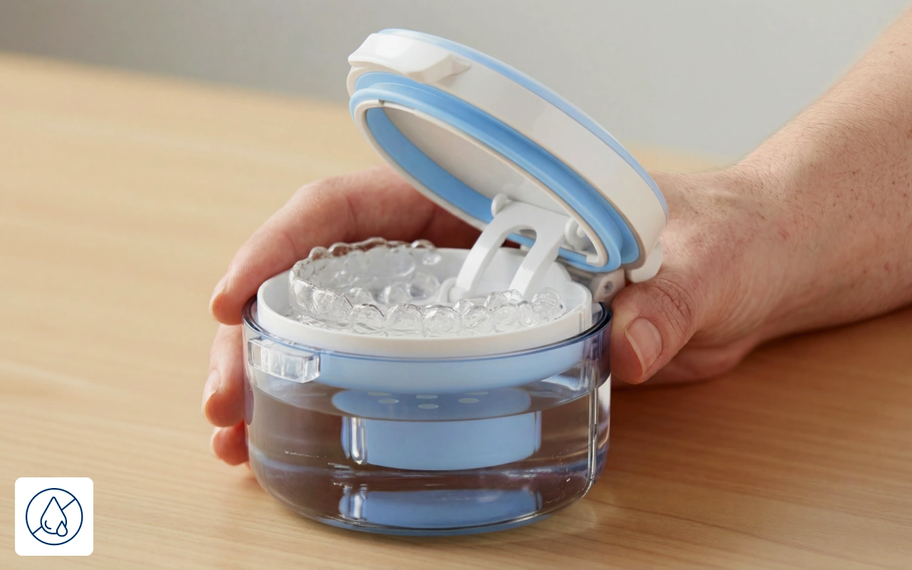 Compré este estuche para retenedores para mis férulas nocturnas. No gotea en absoluto, incluso cuando las dejo en remojo. Cabe en mi bolso y se limpia muy fácilmente.