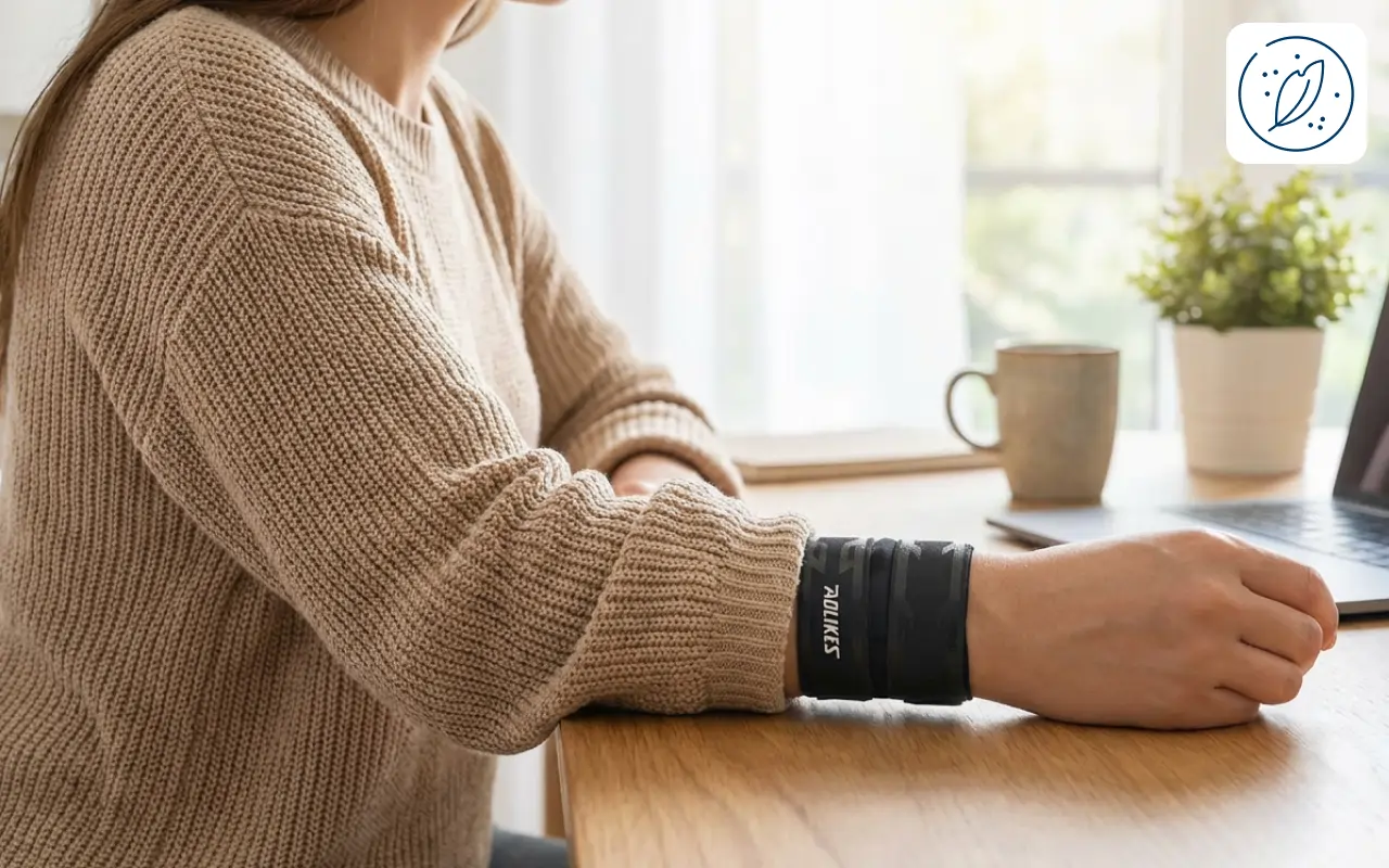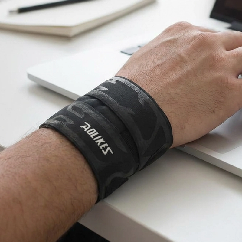 Empecé a usar esta banda de nailon por el codo de tenista y dolor de muñeca. Sujeta suavemente, queda plana bajo las mangas y me permite mover el brazo libremente en la cancha.