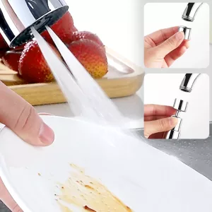 Las dobles articulaciones giratorias te permiten dirigir el agua a cualquier lugar rápidamente. No se pierde ningún rincón, incluso en esquinas difíciles o cazuelas profundas.