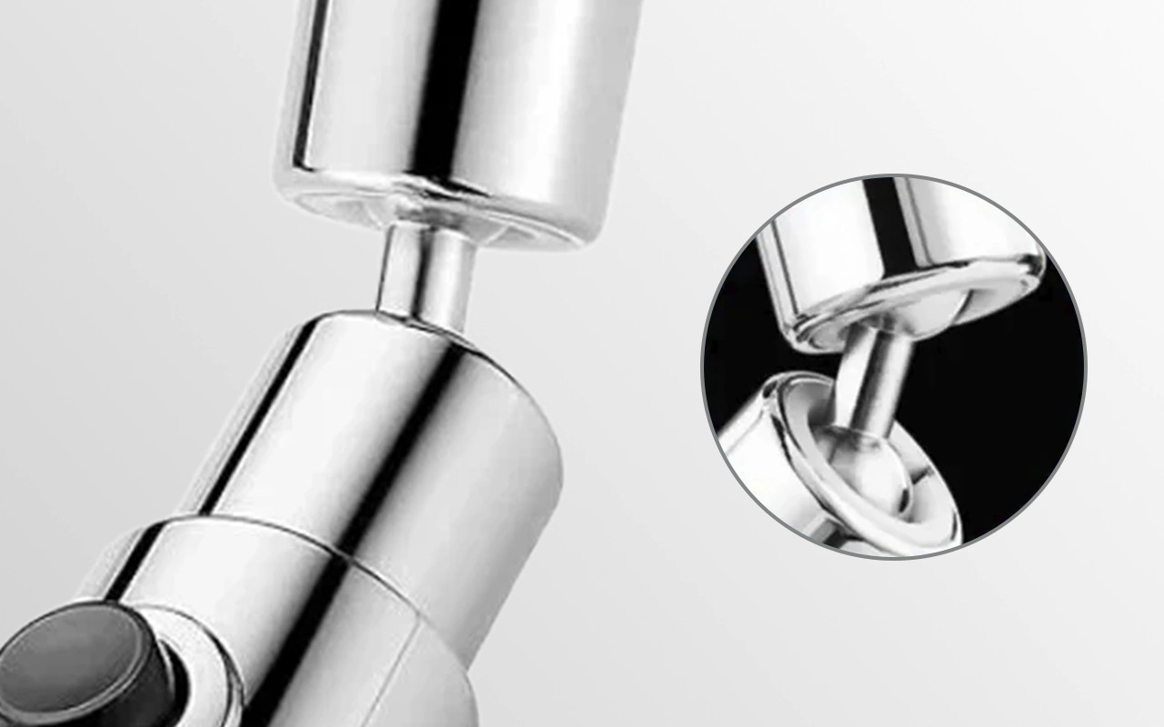 Las dobles articulaciones giratorias te permiten dirigir el agua a cualquier lugar rápidamente. No se pierde ningún rincón, incluso en esquinas difíciles o cazuelas profundas.