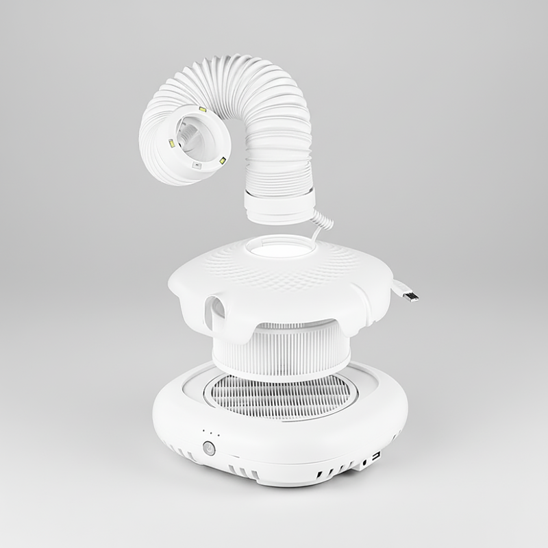 Mi espacio se mantiene ordenado después de cada set de uñas. El tubo 360 se mueve en cualquier dirección que necesito, lo que es genial porque hago mucho arte en uñas. Me encanta lo sencillo que es.