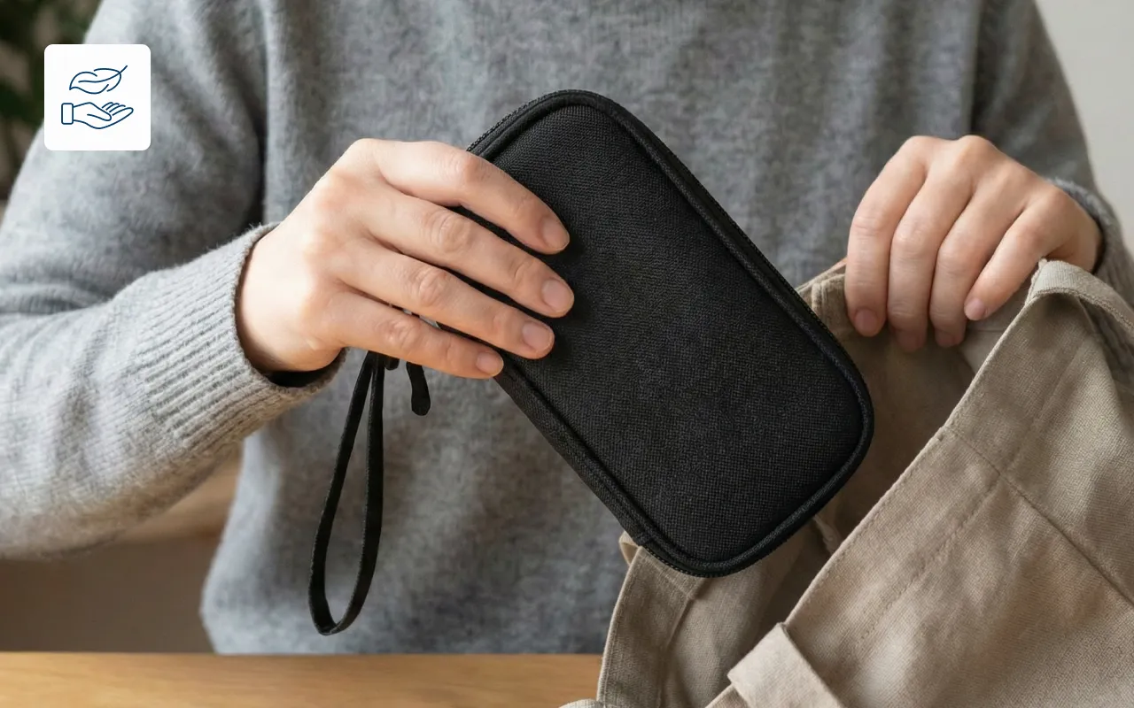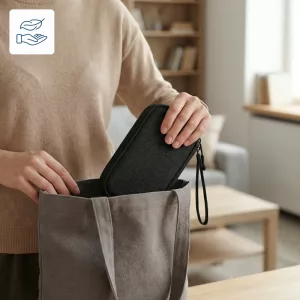 El diseño ligero cabe fácilmente en bolsos, bolsillos o manos. Lleva el organizador Ortorex a cualquier parte sin volumen ni molestias extra.