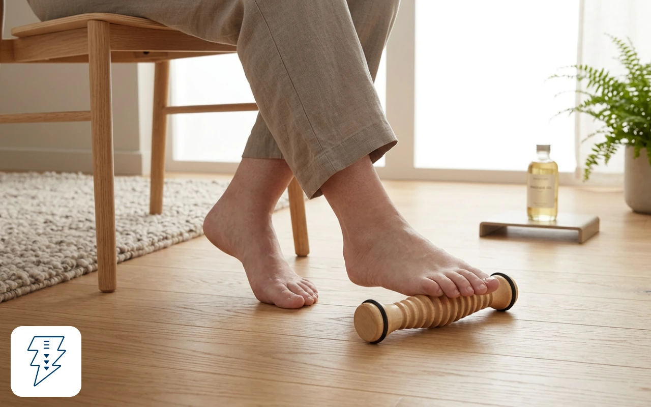 Dejo el rodillo junto a mi cama y lo uso antes de dormir. Mis arcos ya no laten por la noche y me despierto con pies felices.